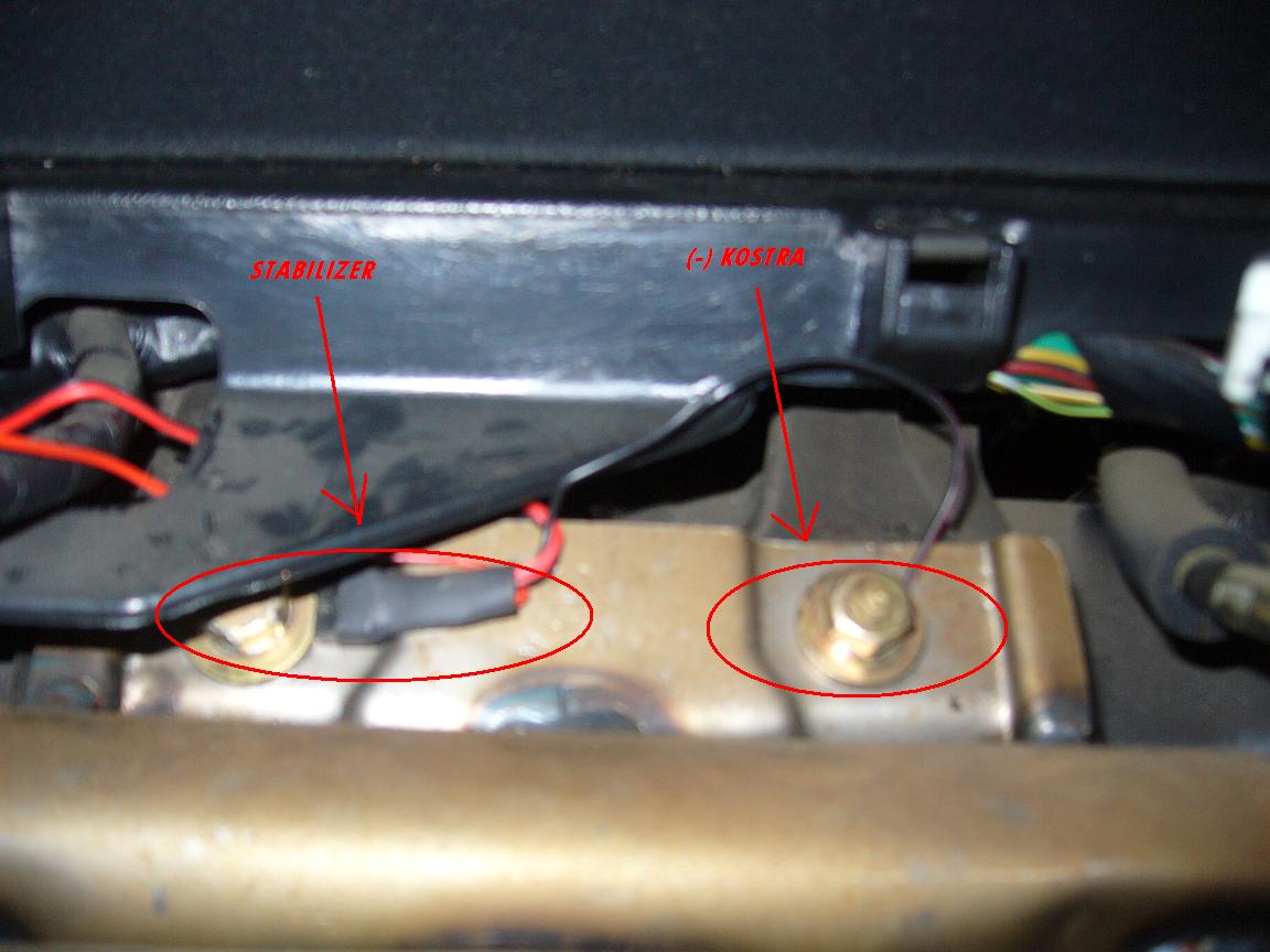 ...Pak vemte izolovací pásku a dobře to zalepte, aby se to nevyzkratovalo. Ten černý drát s červeným pruhem (-) odizolujte v délce cca 5mm připojte v autě někde na kostu (ke karoserii auta) já povolil šroub, který držel výztuhu pod volantem a přitáhl jsem to pod něj. Ale pozor ať to má dobrý kontakt, pokud tam bude vrstva barvy, tak to asi nebude mít kontakt, v místě kde jsem to připojoval já nebylo nalakováno, takže OK. Pak tam máme stabilizér (údajně to má snad fungovat jako nějaký chladič) tak jsem to přitáhl pod druhý šroub, který držel výztuhu pod volantem...