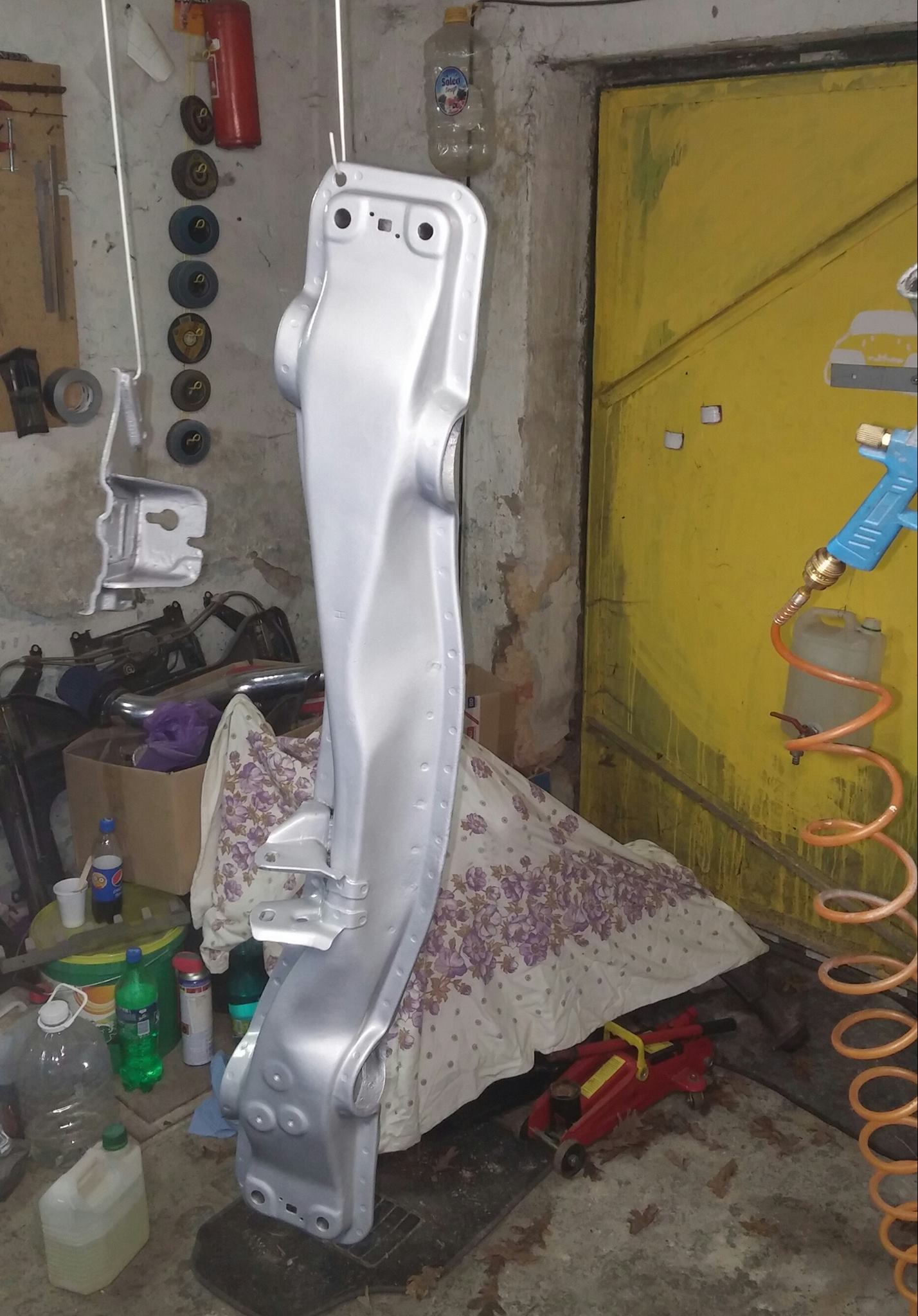 Pískování a pozink jsem vynechal, jen jsem ho drátěným kotoučem několik hodin pěkně pucoval a pak ho stříkl dvousložkovou barvou na třmeny od foliatecu. Je sice poněkud dražší, ale mam jí prublou a je fakt nezničitelná.