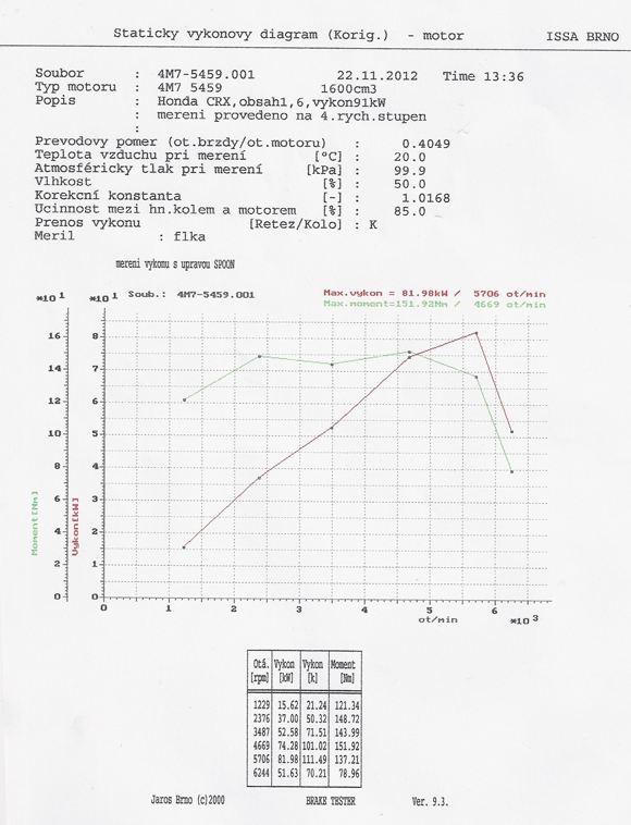 Naměřený výkon se sériovou jednotkou byl 67,94 kW což nechápu a radši se ani nebudu vyjadřovat. S ŘJ s čipem od Spoonu jsme naměřili 81,98 kW. Vypočítaný výkon na motoru podle počítače byl 111 kW. Na grafu je pěkně vidět pokles výkonu kolem 3500 ot./min. V autě je to znát, začne sebou cukat. Snad mi někdo poradí čím by to mohlo být