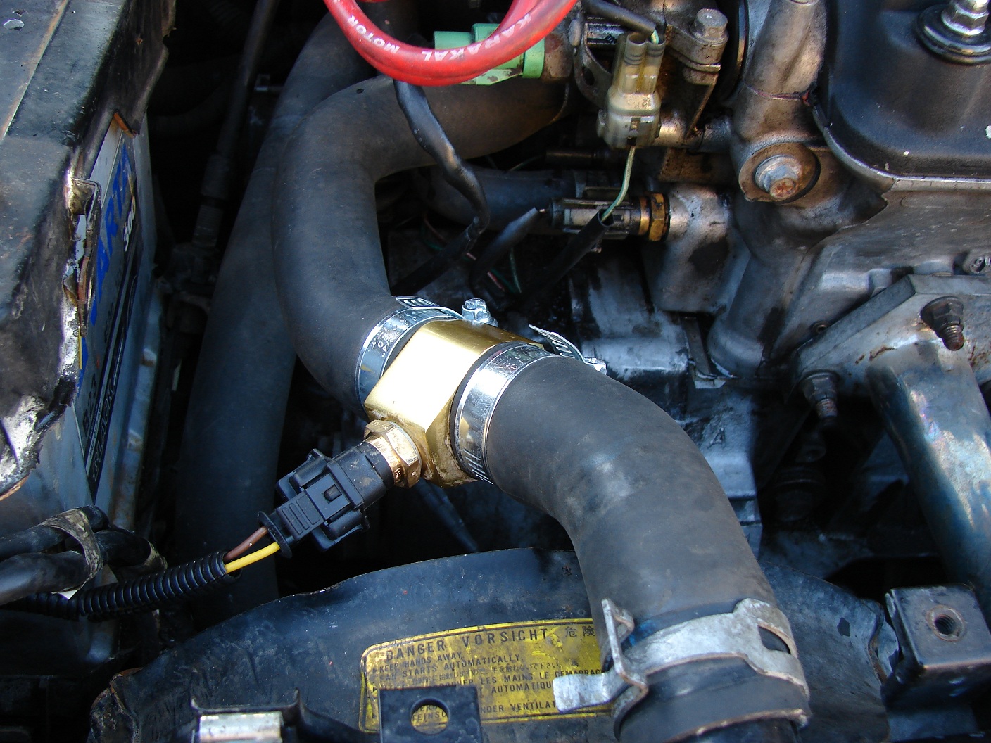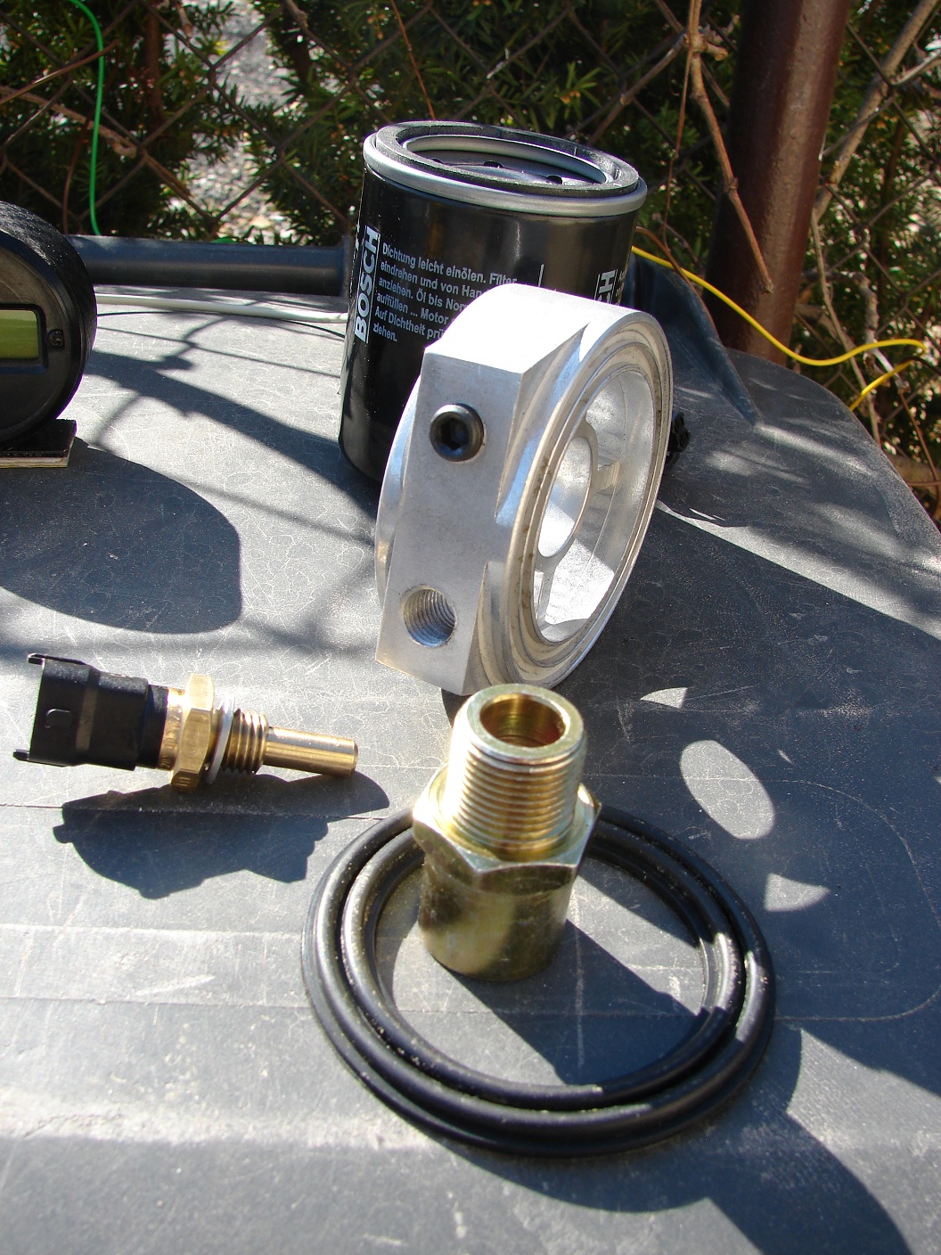 Takže se vypustila voda, rozřízla se přívodni hadice, z ní se kus odřízl a vložil se mezikus s čidlem.Dal jsem jej max 15cm od konce hadice u chladiče a nasměroval čidlo ke svazku drátů předních mlhovek s tím, že společně s ním povede i kabelaž od čidla.Dále jsem vypustil olej, odšrouboval filtr a začal s montáží sendviče.Tento mezikus je stáhnuty šroubem, který má na jednom konci vnitřní a na druhém venkovní závit.Takže se přidrží mezikus s těsněním a přitáhne koncem s vniřním zavitem.Jenže ouha, šroub na konci závitu a sendvič stále volny.Takže troška měřeni a rozhodnutí o zkrácení šroubu ze strany vnitřního závitu o 5mm to vyřešilo.Důkladně očistit, vyfoukat a zpět montovat...........aaaano zadařilo se.Ještě vymyslet natočení sendviče, aby nezavazelo čidlo, konečné dotahnutí a montáž nového filtru na venkovní závit.Tady bych dodal, že jsem doposud dával vždy jenom a pouze olej. filtr BOSH P2036, ale jeho venkovni průměr přesahoval o cca 5mm na každou stranu pres sendvič.Takže jsem zvolil trošku menší filtr BOSCH P2041.Nejspíš by to nedělalo neplechu, protože těsnící část je uplně stejná, ale takto vypadá líp a je i o neco kratší.Dále natáhnout ochranný "husí krk" za kabeláž, zapojit čidla a pustit se do spojování kabeláže.Nejsem žadný odborník, ale jistou představu jsem měl a po pár dotazech, zda to tak smím provést, jsem se do teho pustil.Zdroj i kostru jsem vzal u zapalovače, abych splnil podmínku-přívodu proudu až na zaplé zapalování.Vše bylo hotovo, takže zkouška.....k mému udivu se vše povedlo napoprvé a s vekým úžasem jsem sledoval oznamováni displeji.