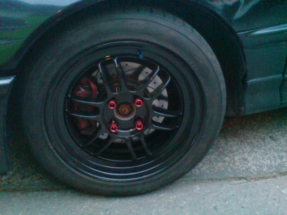 Takže... koenčně jsou na autě udělané nově silentbloky na motoru, takže vibrace jsou už téměř pryč. Není to sice jak staré CRX, ale s polyurethany to asi jinak nejde. Koupené nové disky (jeden disk 4,5kg), jsou to kované Enkei RPF1 v černé lesklé barvě. Plus lehké červené matičky. Auto ožilo vzhledově o 200%.