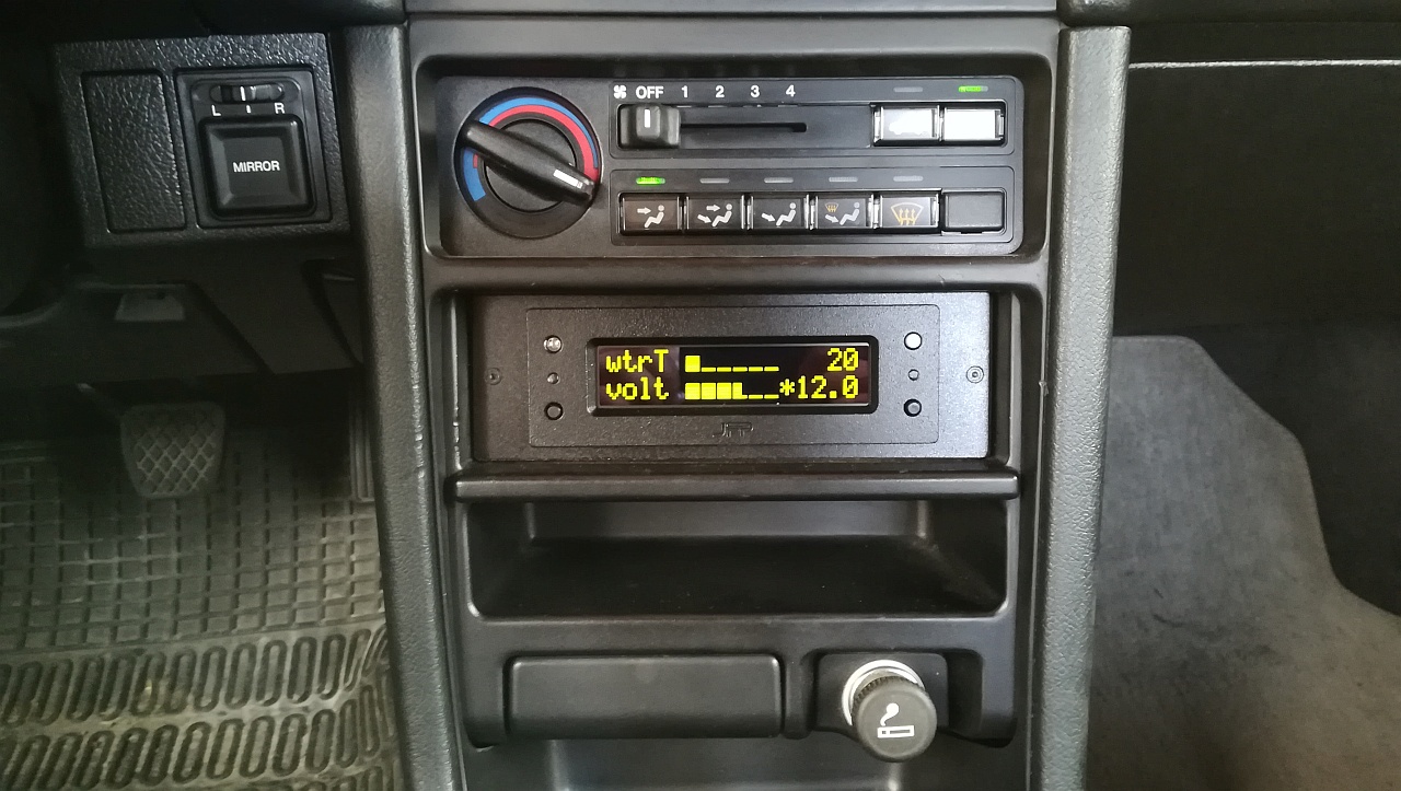Zároveň sem namontoval svůj OLED zobrazovač MG-01XL. Pro snažší a rozebíratelnou montáž kabeláže k čidlům sem si vyrobil hliníkovou záslepku s 12 pinovým IP68 konektorem, která pasuje místo gumový záslepky a trubek klimatizace.
