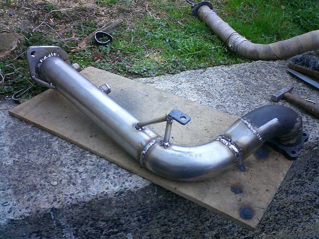 Přírubu a jedno koleno sem použil z původní downpipe, kterou sem koupil s turbem. Musel sem ten celek sice komplet rozřezat a převařit, aby to páslo, ale nakonec se to dalo použít. Zbytek downpipe sem pak svařil z nových trubek. Za přírubou by se mi víc líbil trochu pozvolnější ohyb dolů, ale kvůli nedostatku místa to už líp udělat nešlo.