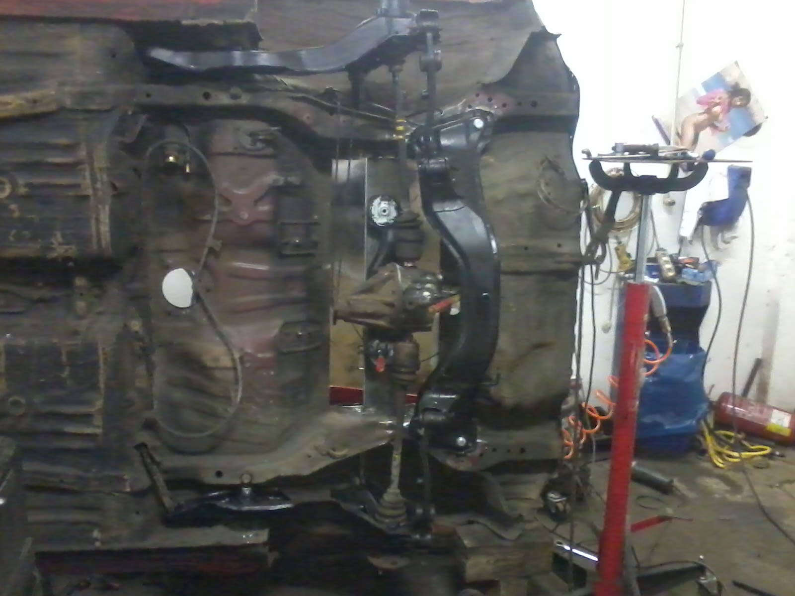 dnes jsem sel z prace driv a zadni naprava je tam. tedy jen na hrubo ale to je to nejdulezitejsi. Jen 2,5 hodiny mi trvalo umistit diferak do presne polohy aby byl presne ve prostred (to je teda blbost protoze on neni veprostred) no proste aby obe poloosy byli tak aby vyjizdeli tak jak maji a nevypadavali z kloubu. A take na rozdil od kolegy z HC jsem posunul dif o 6cm dozadeji (predelal jsem zadni drzak) a asi jeste nekde jsme se rozesli nebot budu muset kardan zkratit o 11cm kdezto on o 25 cm. Posunuti je patrne z fotky kdy poloosy jsou presne obracene proti honde shuttle kdy kola jsou v zadeji nez dif