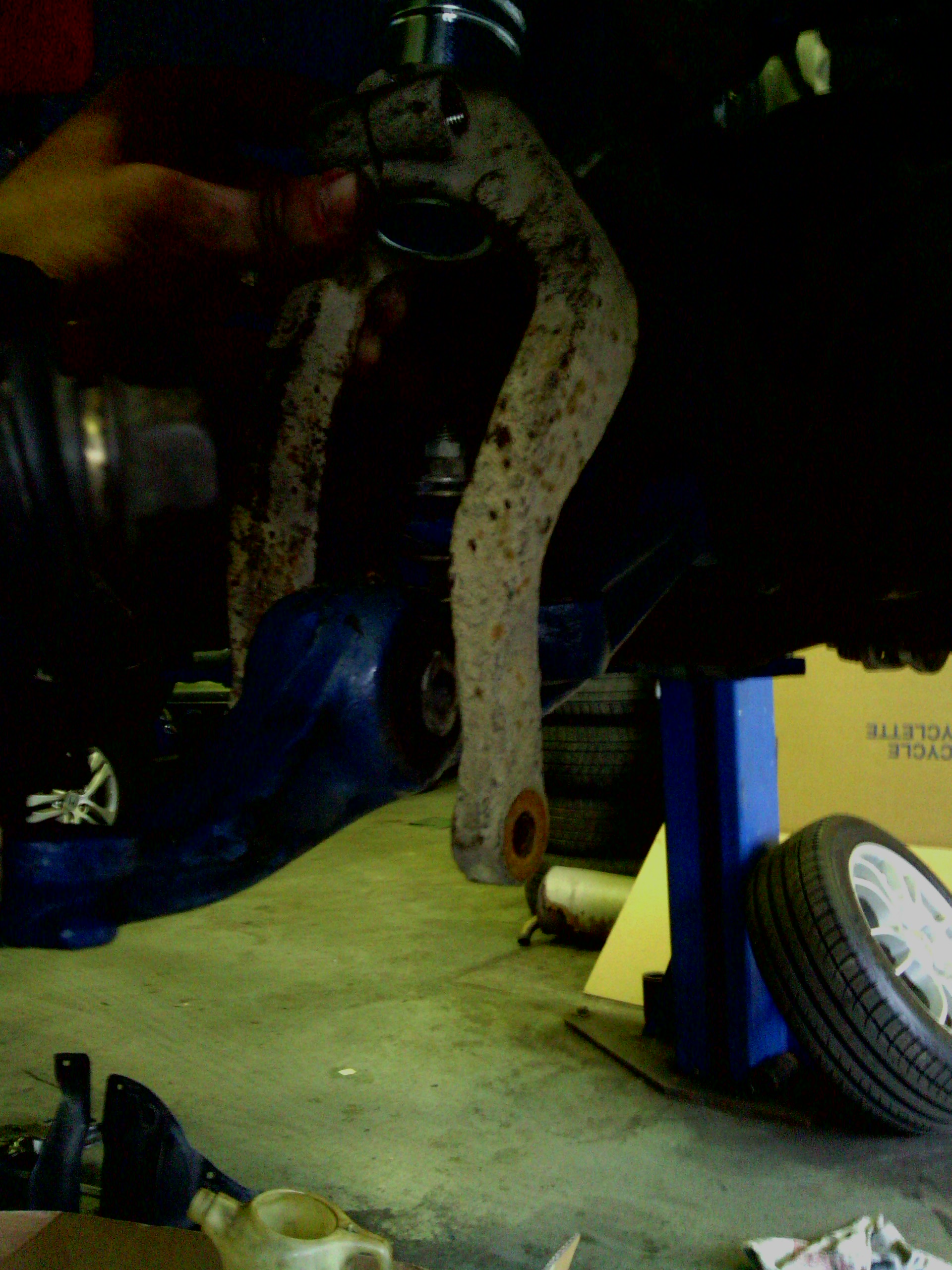 Tak dneska jsem to rysknul a když nebylo co dělat tak jsem hodil cero na hever a začel sundavat převodvku za učelem výměny setrvaku :-) takže setrvak se na míste a už bylo nastartovano :-) nic to neděla :-) tak uvidime v tahu :-) převodovka a všechno už je zase z5 :-) pak jsem začel měnit podvozek a PRŮSER - PODVOZEK NESEDI . mělo jít jen o upravu zadnich tlumiču ale začel jsem přednima tlumičema a už to šlo chyba za chybou :-D tlumič nejde do vydlice co je na ramenu . tlumič ma vetší pruměr a další věc že horní uložení je taky menší ....