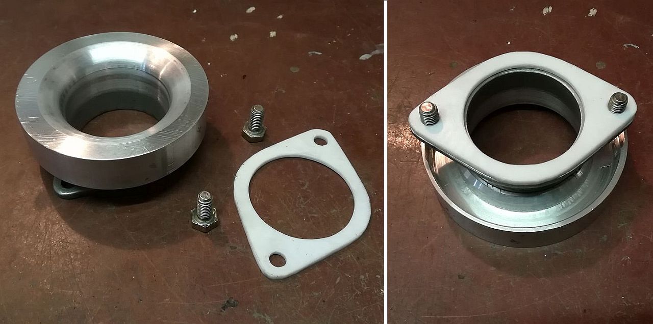 Vzhledem k minimálnímu místu mezi turbem a bokem motoráku byl docela problém najít filtr s dostatečným průtokem a přijatelnými rozměry. Nakonec sem našel jeden od K&N se 102mm přírubou, takže sem musel ještě vyrobit montážní adaptér. Ten je vytočený ze 100mm kulatiny. Jeho výroba byla s ohledem na velikost mýho soustruhu celkem opruz. Kulatinu bych z venku neupnul, takže sem nejdřív musel na vrtačce odvrtat středový otvor (28mm) a přes něj to upnout do soustruhu, proto je to trouchu excentický. Vizuálně to není nic extra, ale funkci to splní a to je hlavní.