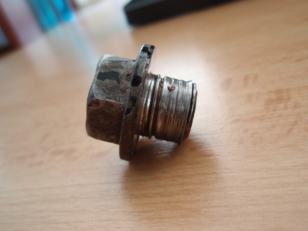 Takže na autě se pomalu v rámci možností pracuje, v současné době řeším hlavně přepis (eko daň). Ale co dnes - chtěl jsem jít vyměnit olej, ok auto jsem zahřál najel na nájezdy a vlezl pod auto. Povoluju vypouštěcí šroub a říkám si, jde to nějak lehce, bodejť šroub je uplně strhlý není na něm žádný závit :x (foto) Celé to bylo zaplácané červeným silikonem aby to tam nějak drželo. Nevím kdo tam teda takový bastl mohl nechat, doufám že to nebyl Redy :shock: Teď čekám až pořádně vykape všechen olej abych mohl zkontrolovat závit na vaně, doufám že bude ok :|