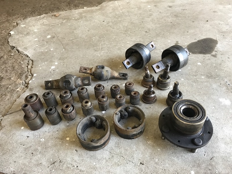 Skoro celé jsme to rozebrali, teď nám kolem auta leží hromada harampádí a my nevíme, co s tím a sraz se pomalu blíží. Samozřejmě si dělám srandu, ale původně to měla být jen výměna čepů a silentbloků, ale nějak se mám to zvrhlo a je z toho už měsíční kompletní renovace nejen podvozku.