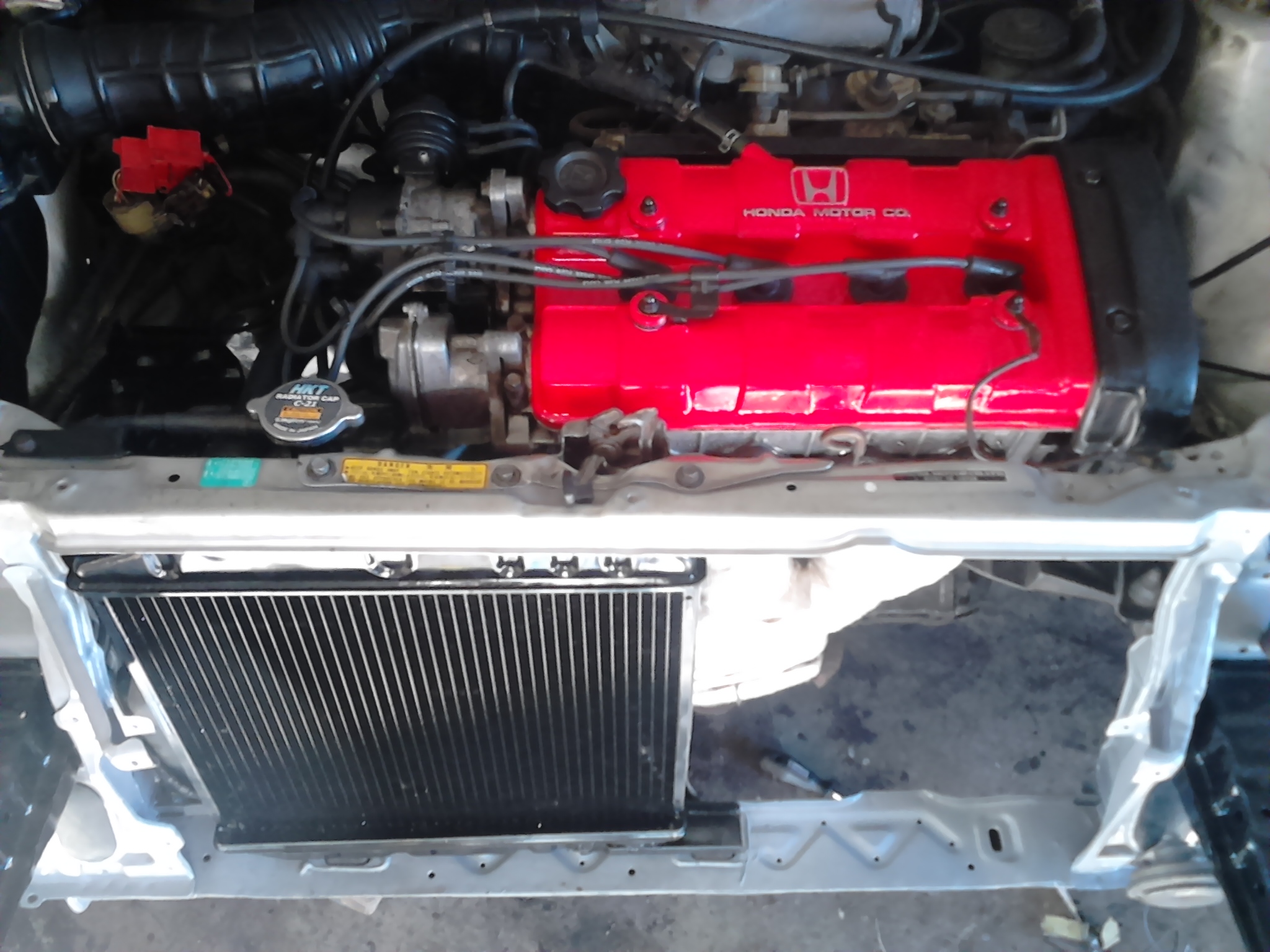 Tak zase pár foteček... Vyměnil jsem spojku, dal zpátky převodovku, víko střiknutý na červeno, a natřenou vanu a nápravu, s novým těsněním všecko. Taky všemožný blbiny, jako jsou držáčky konektorů atd. Jsem natíral skoro všechno, protože to bylo orezlý. Teď čekám na ty silenty, abych mohl dát ramena, těhlice, tlumiče atd. Pak to dám na kola, naleju oleje, dám chladič, svody, dotřu zbytek podvozku, protože zatím mám jen přední polovinu. Snad to do srazu stihnu.